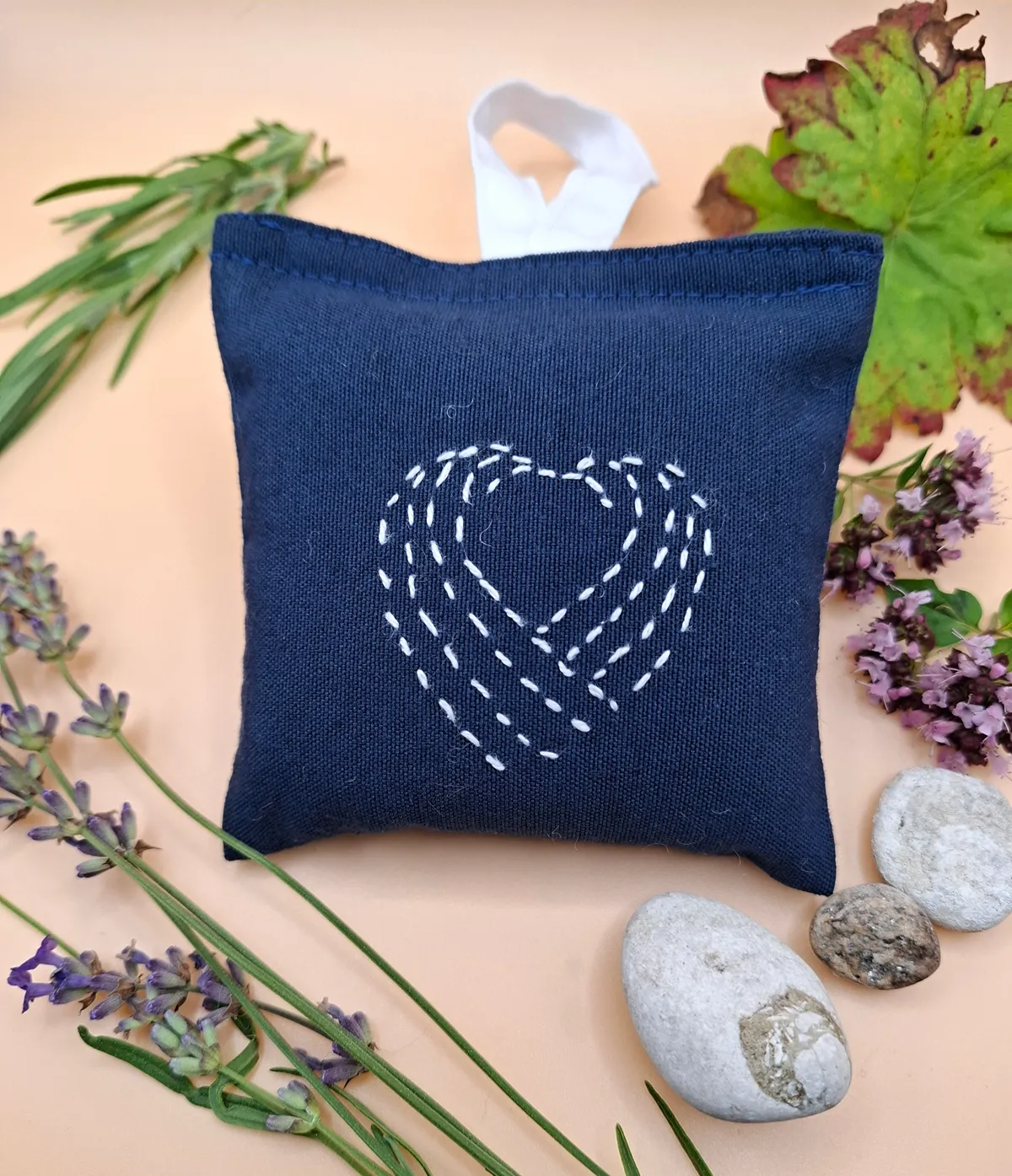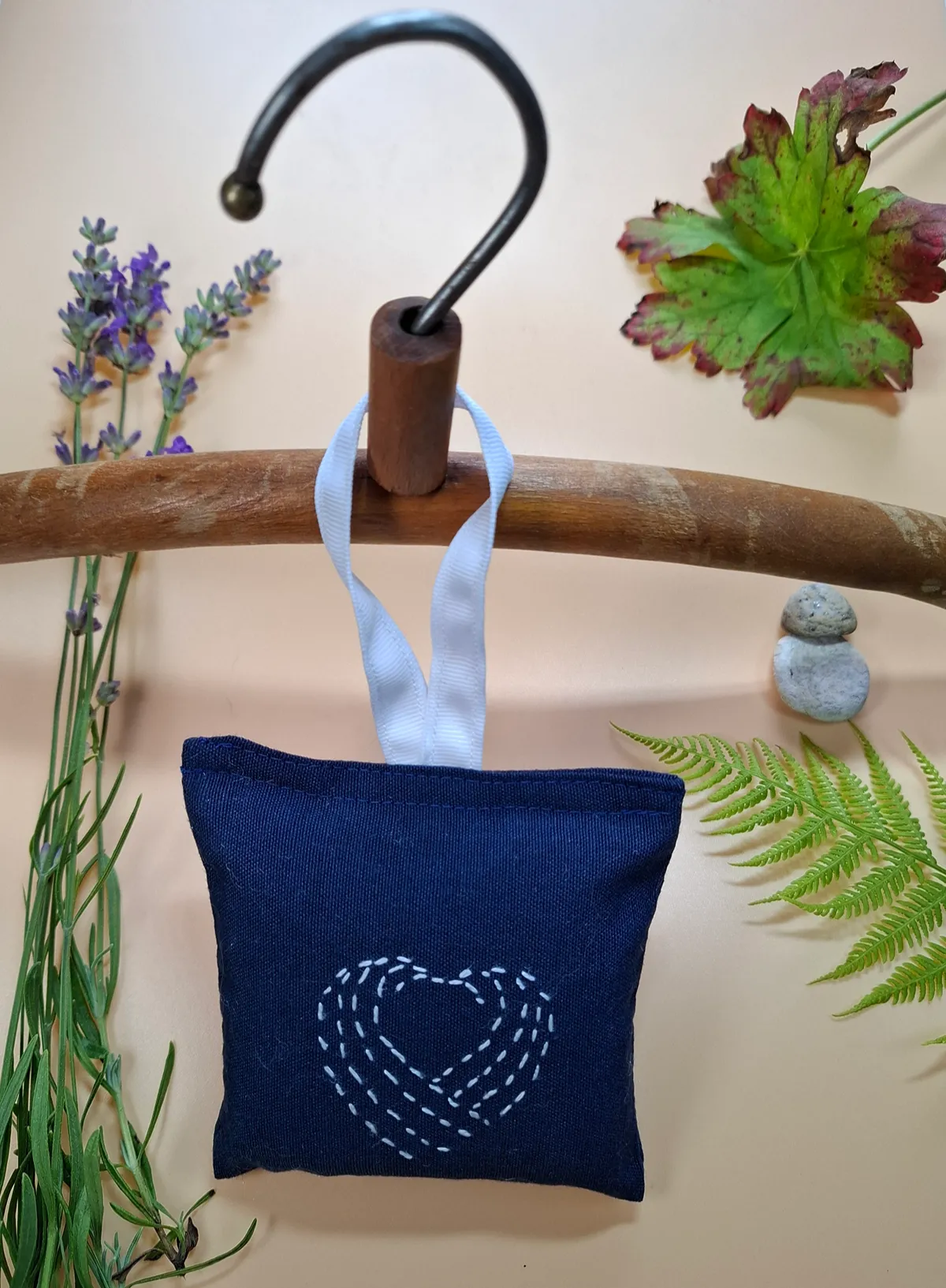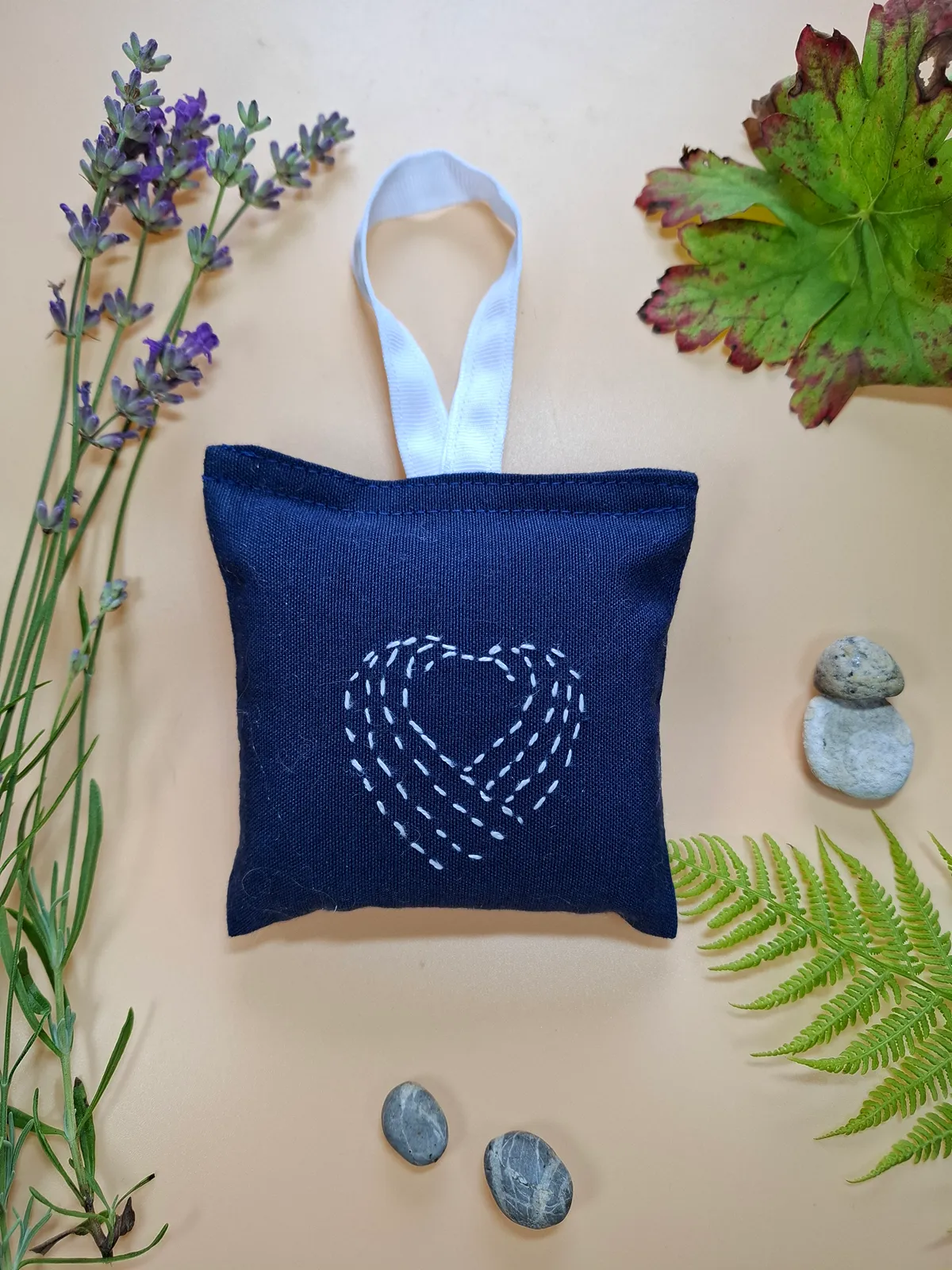 Materiál – bavlna, zdobená ruční výšivkou, výplň, sušená levandule s dutým vláknem. Poutko k zavěšení.